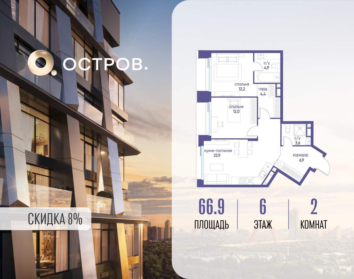 Продаётся 2-комн. квартира от застройщика: общая площадь 66.90 м, жилая 24.20 м, кухня 22.90 м, 6-й этаж, жилой квартал «Остров 12», корпус 1 (секция 1) . Срок сдачи: 1 квартал 2029 года.