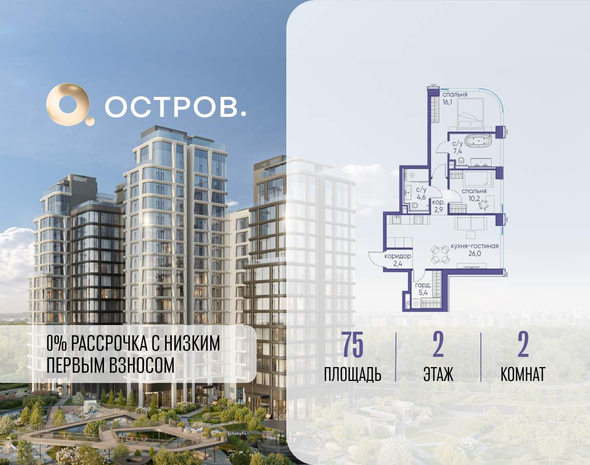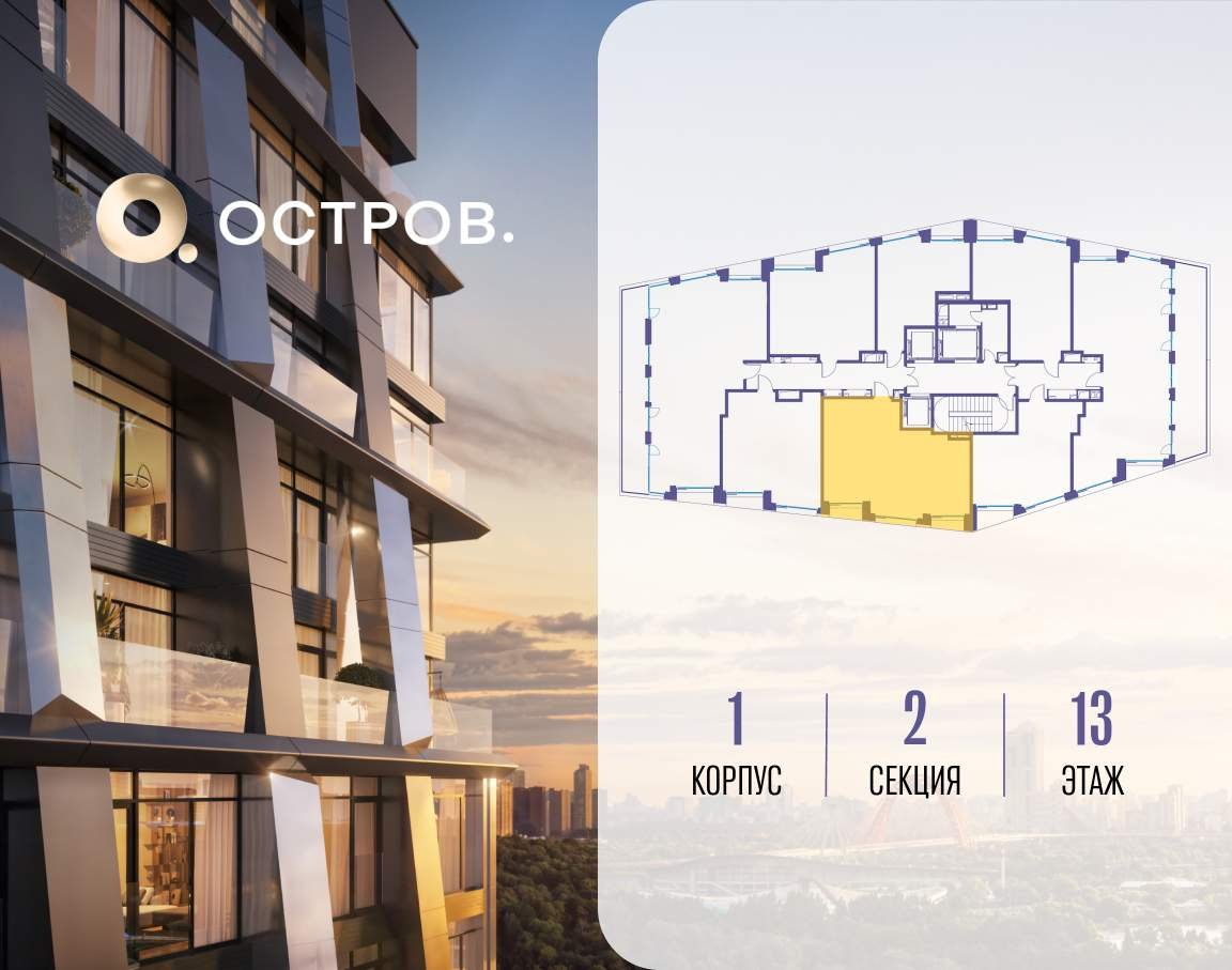 ОСТРОВ от Донстрой - жилой комплекс на западе Москвы, в Мневниковской пойме. Уникальное преимущество комплекса - в том, что он обособлен от города рекой и природным парком (650 га) . Благодаря природному окружению эта территория имеет лучший экологический рейтинг в столице. Кварталы ОСТРОВА объединены ландшафтным дизайном в единое пространство - с набережными и Центральным бульваром. На ОСТРОВЕ любые объекты, необходимые для полноценной жизни и отдыха, находятся на расстоянии 15-минутной прогулки. Торговый центр и супермаркеты, кафе и рестораны, фитнес, салоны красоты, школы и детские сады. А также крупнейший в Москве спортивный кластер.