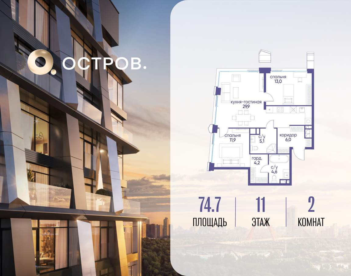 Продаётся 2-комн. квартира от застройщика: общая площадь 74.70 м, жилая 24.90 м, кухня 29.90 м, 11-й этаж, жилой квартал «Остров 12», корпус 3 (секция 1) . Срок сдачи: 1 квартал 2029 года.