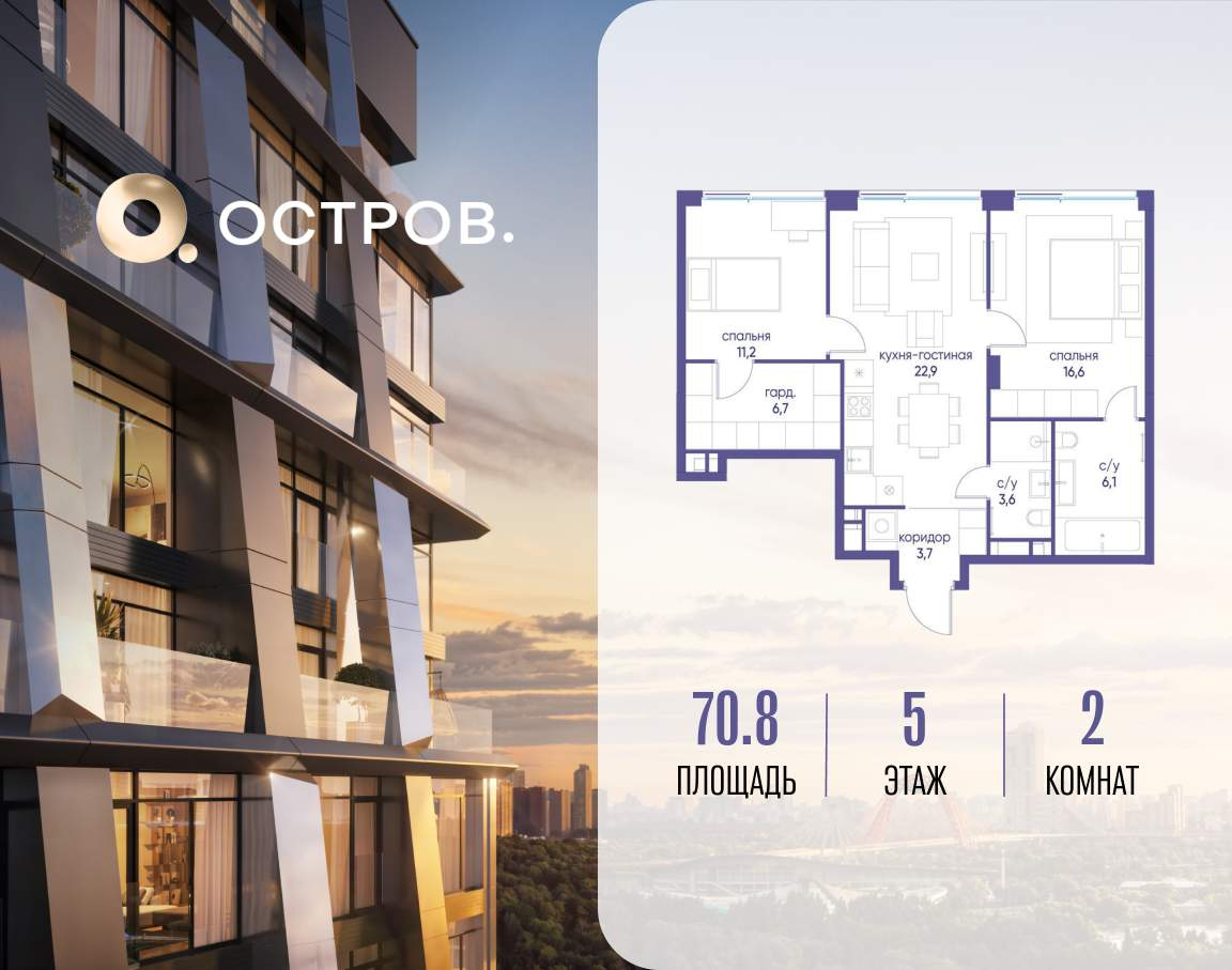 Продаётся 2-комн. квартира от застройщика: общая площадь 70.80 м, жилая 27.80 м, кухня 22.90 м, 5-й этаж, жилой квартал «Остров 12», корпус 2 (секция 1) . Срок сдачи: 1 квартал 2029 года.