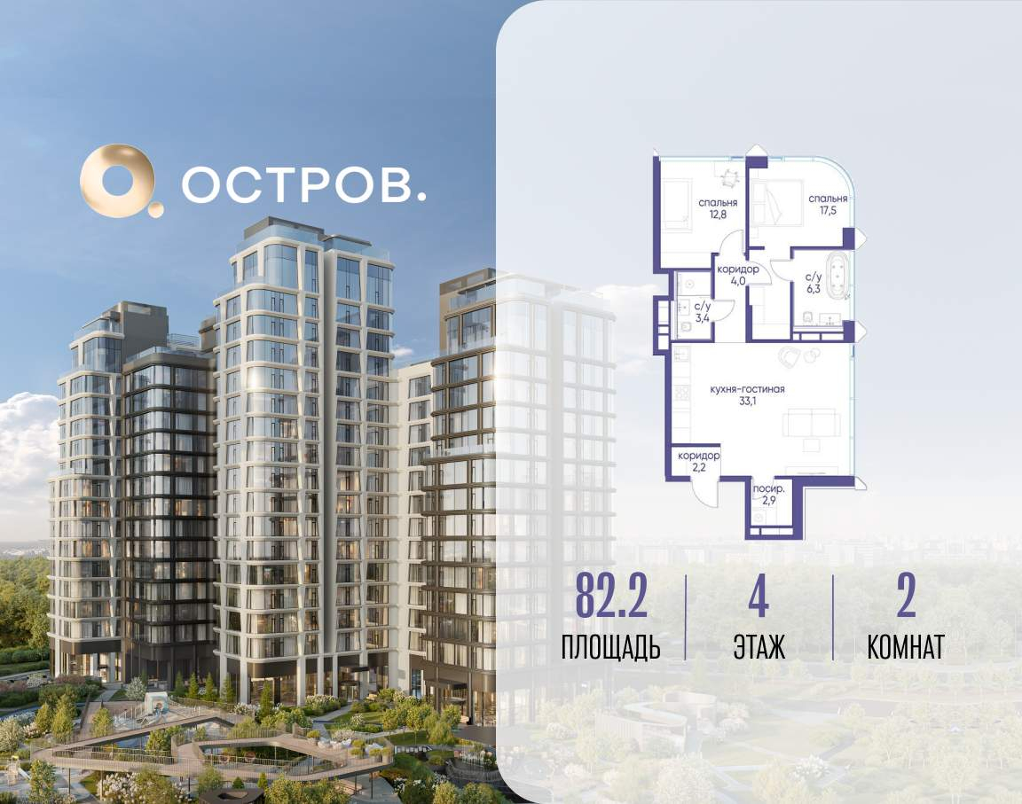Продаётся 2-комн. квартира от застройщика: общая площадь 82.20 м, жилая 30.30 м, кухня 33.10 м, 4-й этаж, жилой квартал «Остров 12», корпус 2 (секция 2) . Срок сдачи: 1 квартал 2029 года.