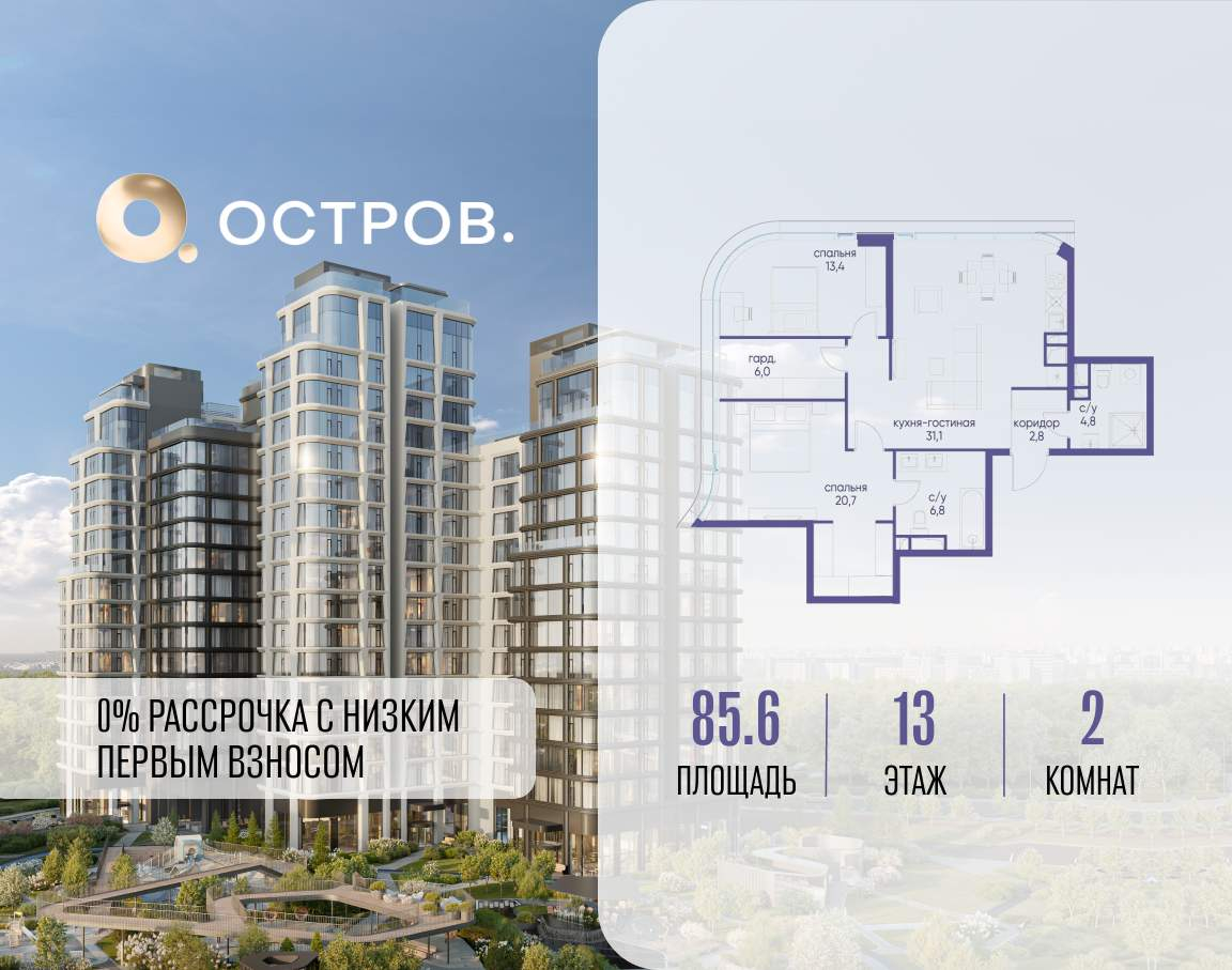 ОСТРОВ от Донстрой - жилой комплекс на западе Москвы, в Мневниковской пойме. Уникальное преимущество комплекса - в том, что он обособлен от города рекой и природным парком (650 га) . Благодаря природному окружению эта территория имеет лучший экологический рейтинг в столице. Кварталы ОСТРОВА объединены ландшафтным дизайном в единое пространство - с набережными и Центральным бульваром. На ОСТРОВЕ любые объекты, необходимые для полноценной жизни и отдыха, находятся на расстоянии 15-минутной прогулки. Торговый центр и супермаркеты, кафе и рестораны, фитнес, салоны красоты, школы и детские сады. А также крупнейший в Москве спортивный кластер.