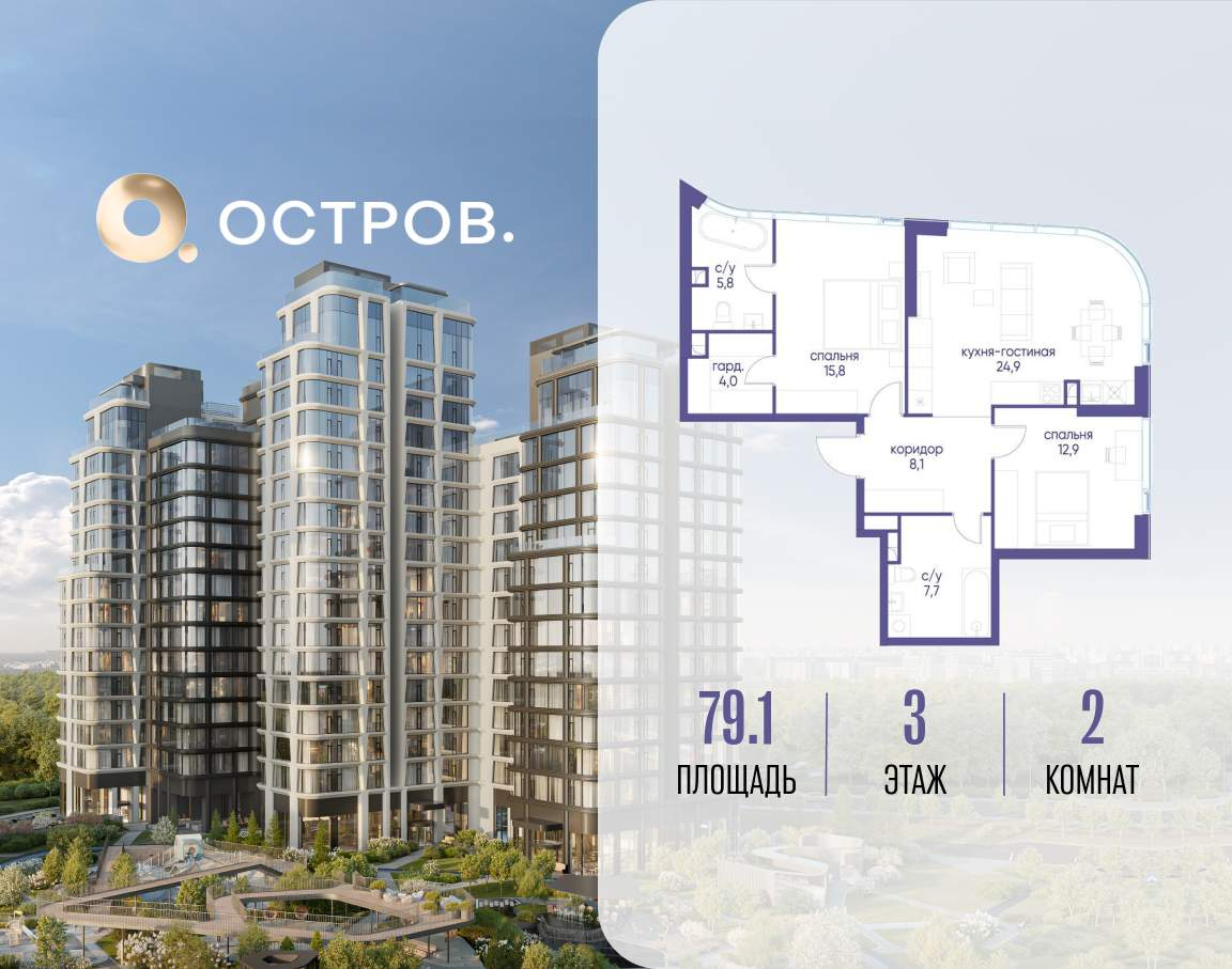 Продаётся 2-комн. квартира от застройщика: общая площадь 79.10 м, жилая 28.70 м, кухня 24.90 м, 3-й этаж, жилой квартал «Остров 12», корпус 3 (секция 1) . Срок сдачи: 1 квартал 2029 года.