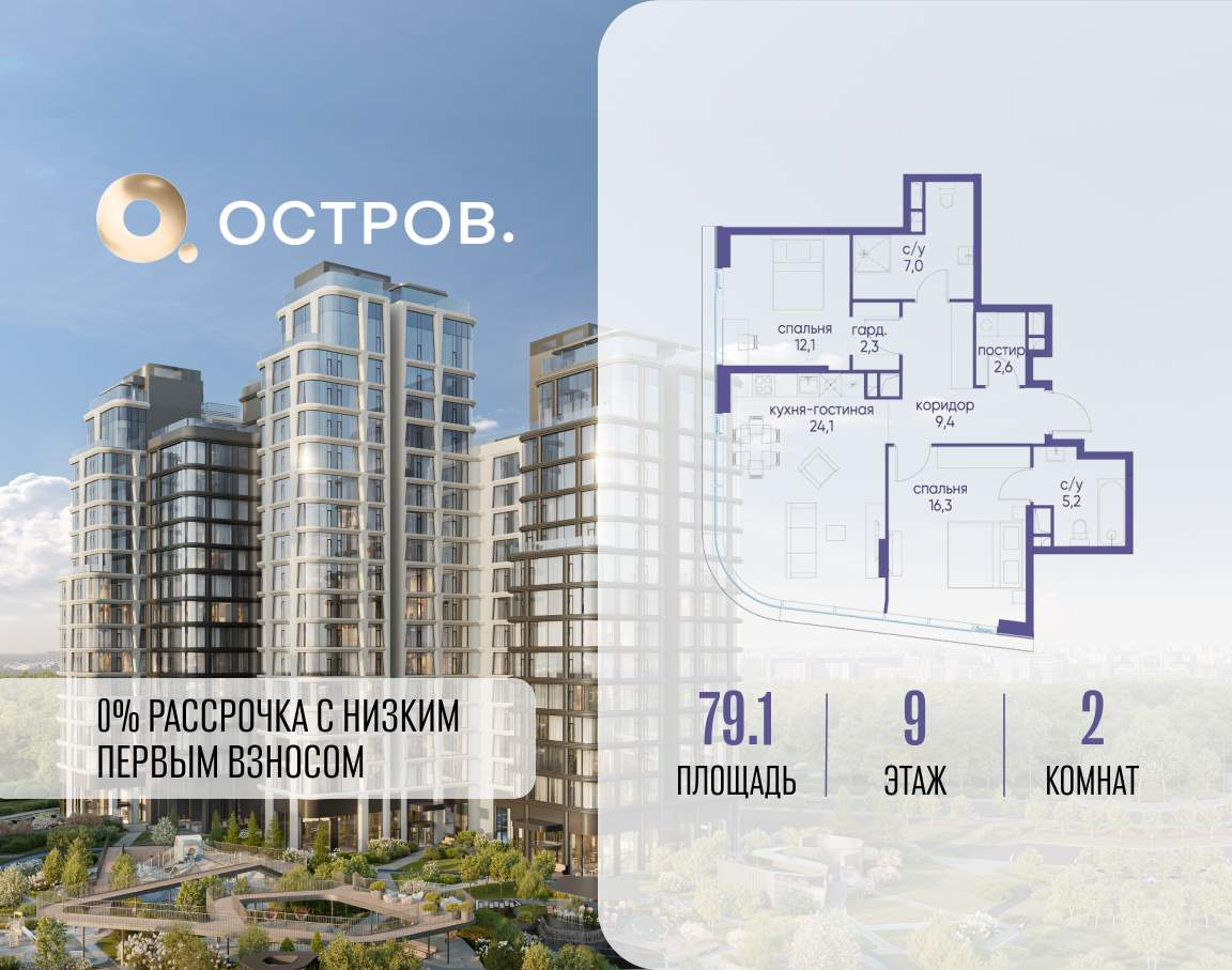 Продаётся 2-комн. квартира от застройщика: общая площадь 79.10 м, жилая 28.40 м, кухня 24.10 м, 9-й этаж, жилой квартал «Остров 12», корпус 6 (секция 1) . Срок сдачи: 1 квартал 2029 года.
