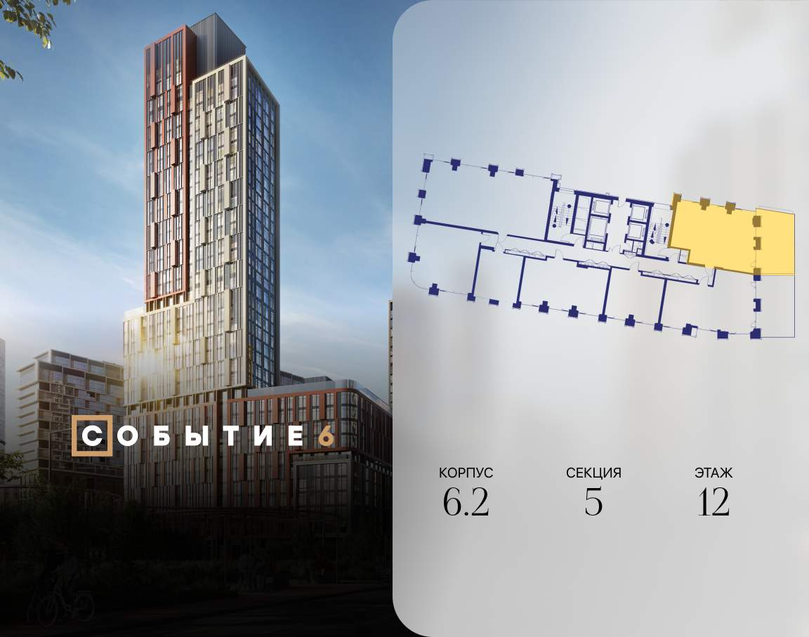 Продаётся 2-комнатная квартира от застройщика: общая площадь 78.80 м, жилая 35.40 м, кухня 15.90 м, 12-й этаж, жилой квартал «Событие-6», корпус 2 (секция 5) Срок сдачи: 1 квартал 2029 года.