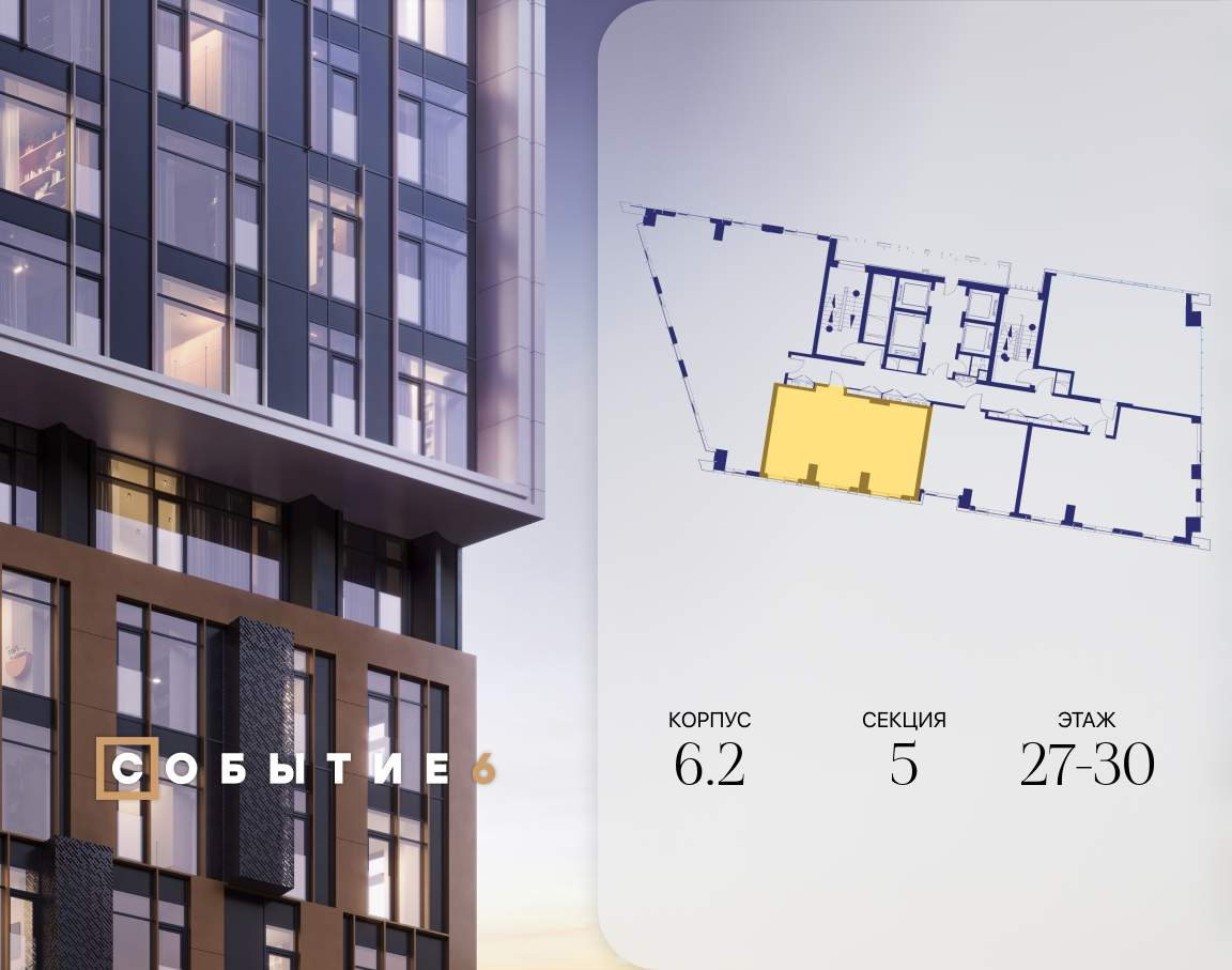Продаётся 2-комнатная квартира от застройщика: общая площадь 61.80 м, жилая 32.90 м, кухня 17.80 м, 27-й этаж, жилой квартал «Событие-6», корпус 2 (секция 5) Срок сдачи: 4 квартал 2029 года.