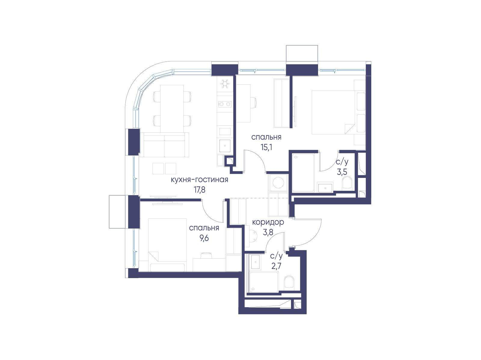 Продается 2-комнатная квартира от застройщика: общая площадь 52.50 м, жилая 24.70 м, кухня 17.80 м, 18-й этаж, жилой квартал «Гордость», корпус 40 (секция 1) . Срок сдачи: 2 квартал 2029 года.