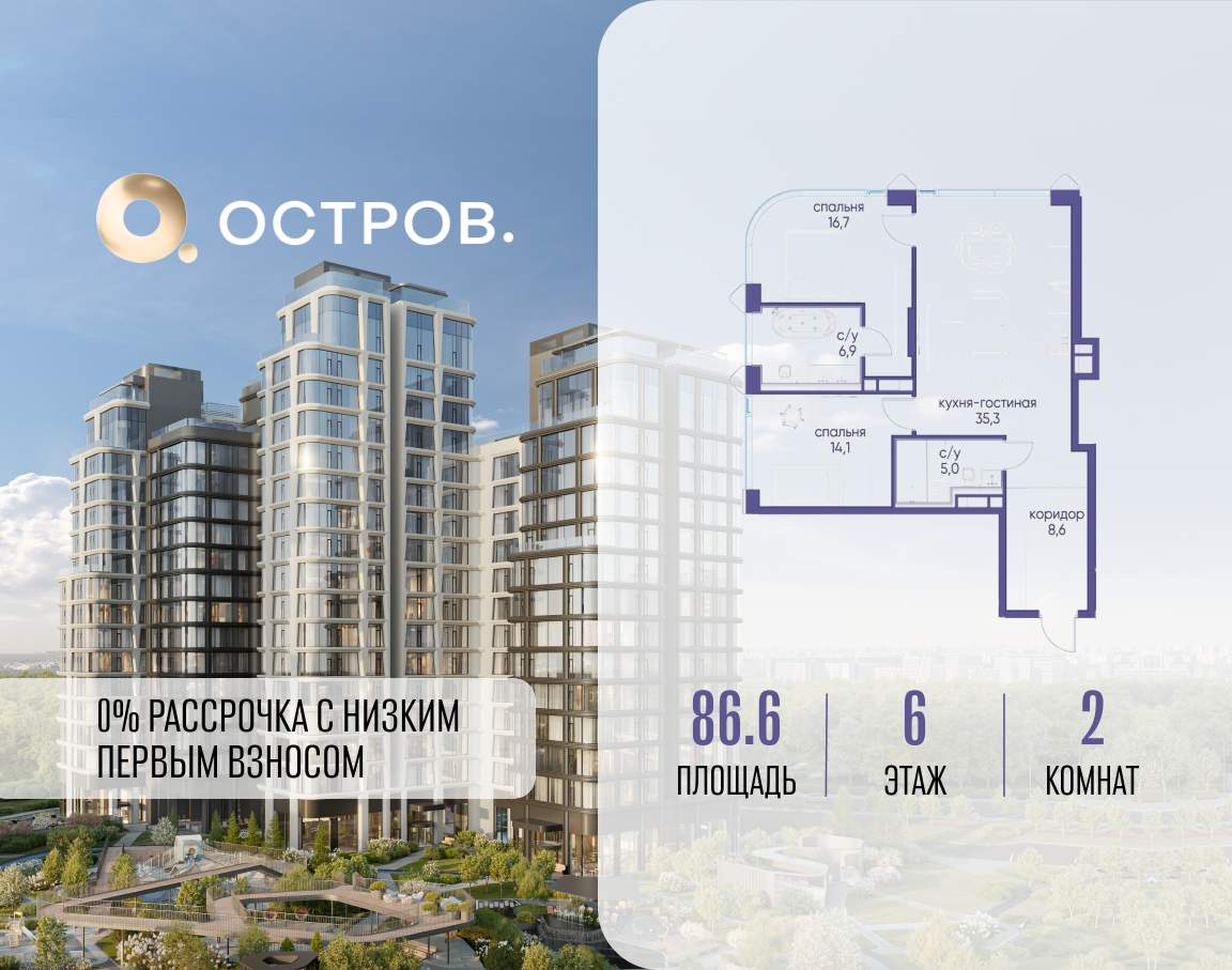Продаётся 2-комн. квартира от застройщика: общая площадь 86.60 м, жилая 30.80 м, кухня 35.30 м, 6-й этаж, жилой квартал «Остров 12», корпус 2 (секция 2) . Срок сдачи: 1 квартал 2029 года.