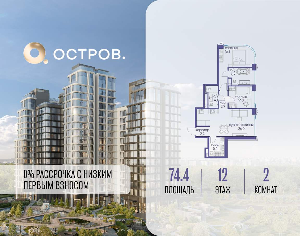 Продаётся 2-комн. квартира от застройщика: общая площадь 74.40 м, жилая 26.30 м, кухня 26.00 м, 12-й этаж, жилой квартал «Остров 12», корпус 1 (секция 3) . Срок сдачи: 1 квартал 2029 года.