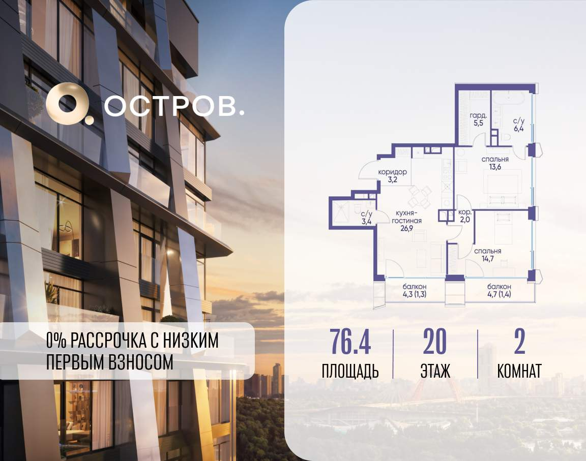 Продаётся 2-комн. квартира от застройщика: общая площадь 76.40 м, жилая 28.30 м, кухня 26.90 м, 20-й этаж, жилой квартал «Остров 12», корпус 3 (секция 1) . Срок сдачи: 1 квартал 2029 года.