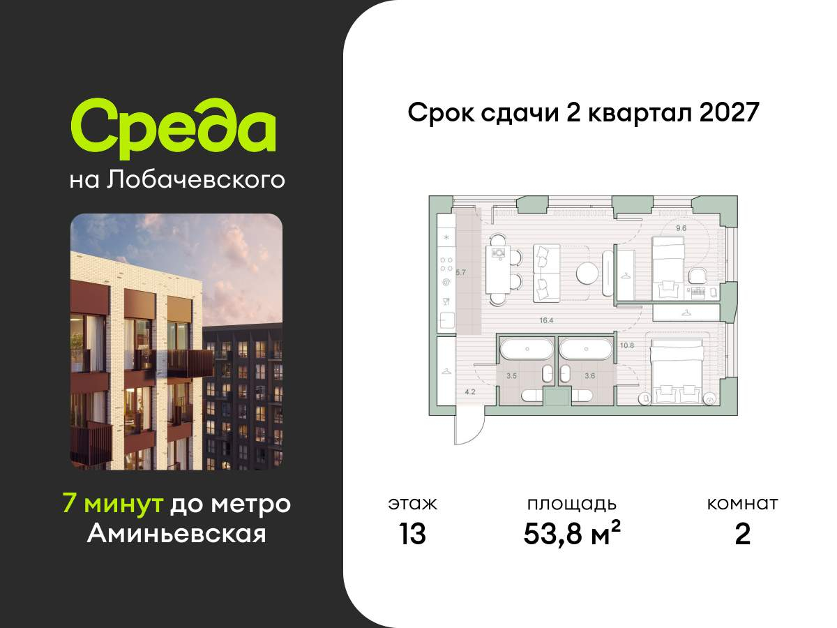 Продаются 2-к апартаменты площадью 46.8 кв.м. на 12-м этаже 28 этажного дома в "ЭМОУШН" от ГК ОСНОВА