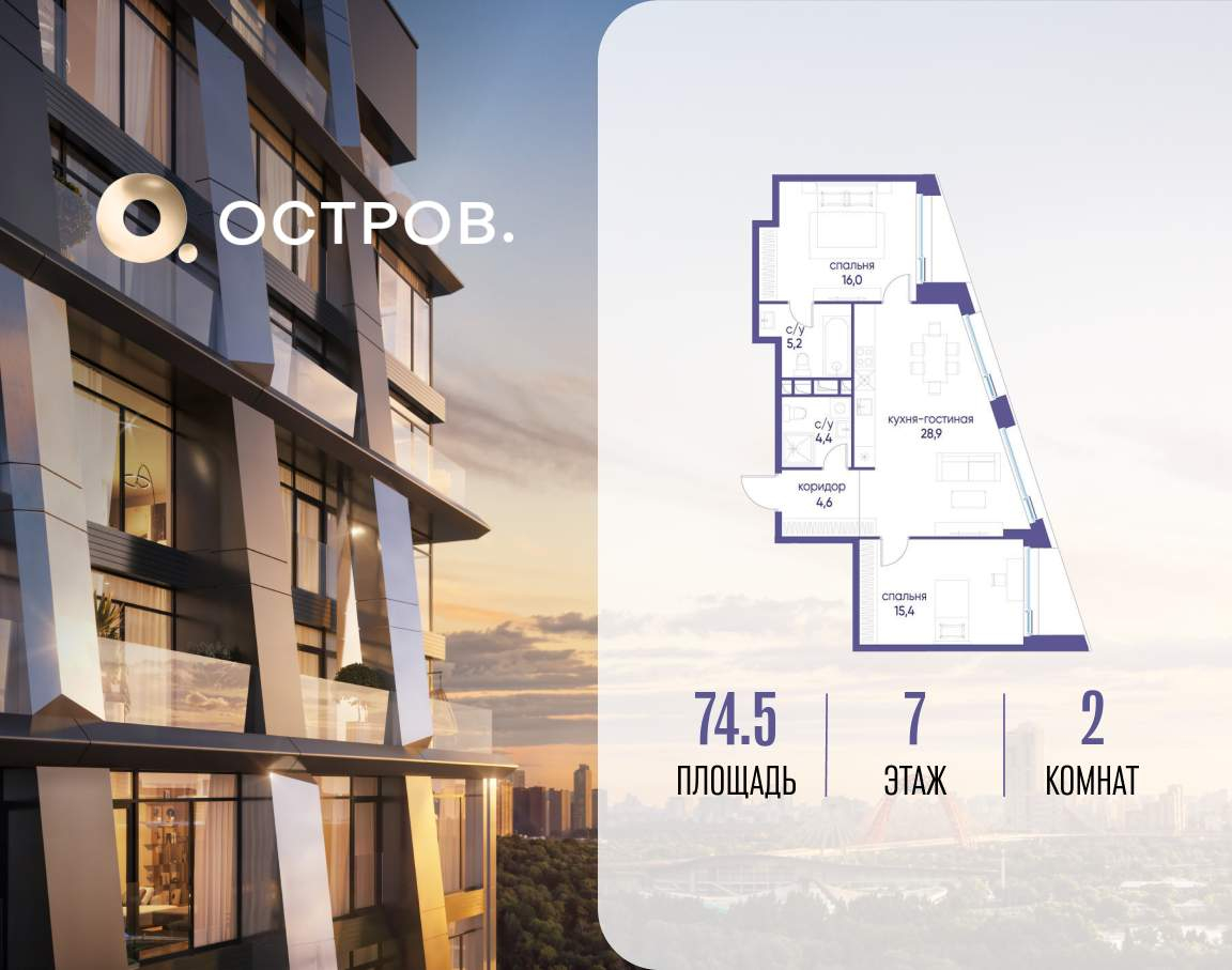 Продаётся 2-комн. квартира от застройщика: общая площадь 74.50 м, жилая 31.40 м, кухня 28.90 м, 7-й этаж, жилой квартал «Остров 12», корпус 1 (секция 2) . Срок сдачи: 1 квартал 2029 года.
