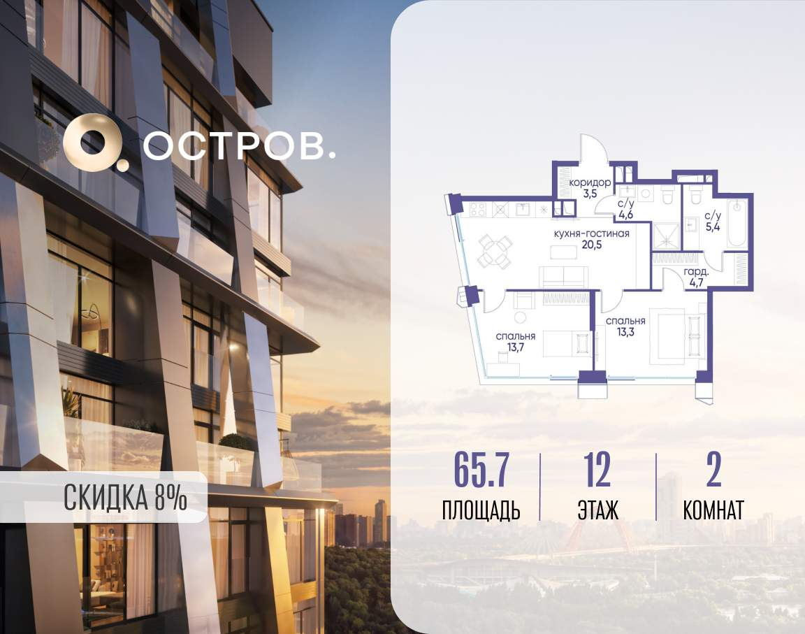 Продаётся 2-комн. квартира от застройщика: общая площадь 65.70 м, жилая 27.00 м, кухня 20.50 м, 12-й этаж, жилой квартал «Остров 12», корпус 3 (секция 1) . Срок сдачи: 1 квартал 2029 года.