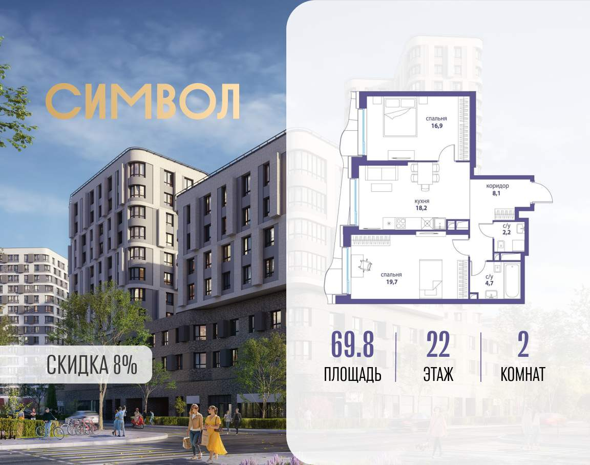 Продается 2-комнатная квартира от застройщика: общая площадь 69.80 м, жилая 36.60 м, кухня 18.20 м, 22-й этаж, жилой квартал «Вдохновение», корпус 34 (секция 1) . Срок сдачи: 4 квартал 2027 года.