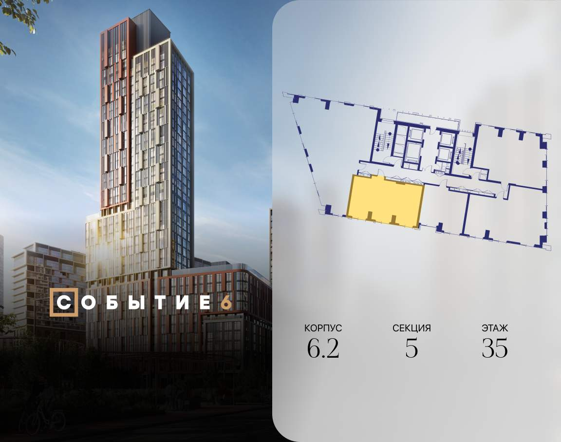 Продаётся 2-комнатная квартира от застройщика: общая площадь 61.90 м, жилая 33.00 м, кухня 17.80 м, 35-й этаж, жилой квартал «Событие-6», корпус 2 (секция 5) Срок сдачи: 1 квартал 2029 года.