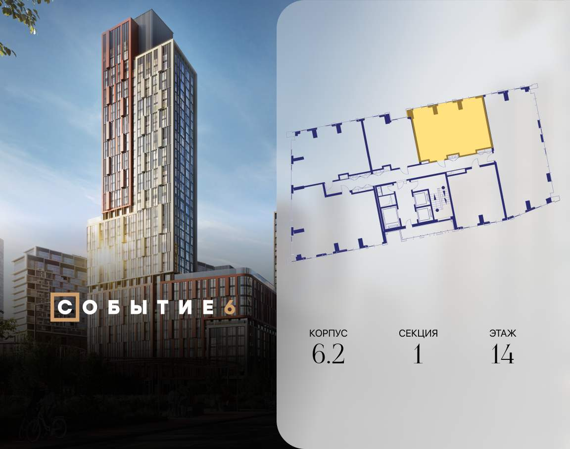 Продаётся 2-комнатная квартира от застройщика: общая площадь 72.50 м, жилая 31.50 м, кухня 24.40 м, 14-й этаж, жилой квартал «Событие-6», корпус 2 (секция 1) Срок сдачи: 1 квартал 2029 года.