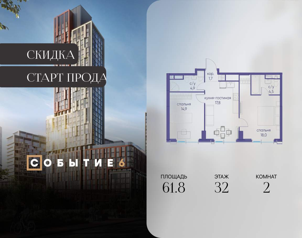 Продаётся 2-комнатная квартира от застройщика: общая площадь 61.80 м, жилая 32.90 м, кухня 17.80 м, 32-й этаж, жилой квартал «Событие-6», корпус 2 (секция 5) Срок сдачи: 1 квартал 2029 года.