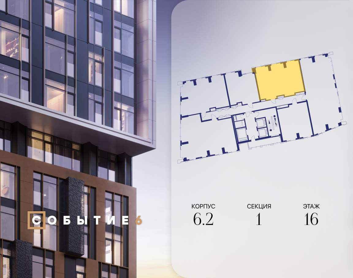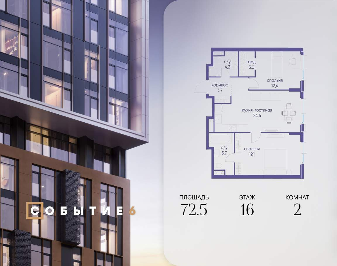 Продаётся 2-комнатная квартира от застройщика: общая площадь 72.50 м, жилая 31.50 м, кухня 24.40 м, 16-й этаж, жилой квартал «Событие-6», корпус 2 (секция 1) Срок сдачи: 4 квартал 2029 года.