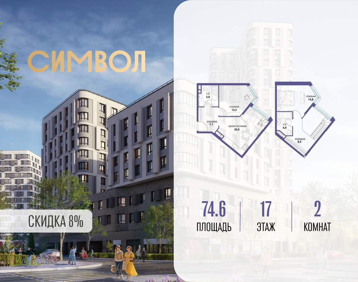 Продается 2-комнатная квартира от застройщика: общая площадь 74.60 м, жилая 28.30 м, кухня 20.00 м, 17-й этаж, жилой квартал «Вдохновение», корпус 28 (секция 1) . Срок сдачи: 4 квартал 2025 года.