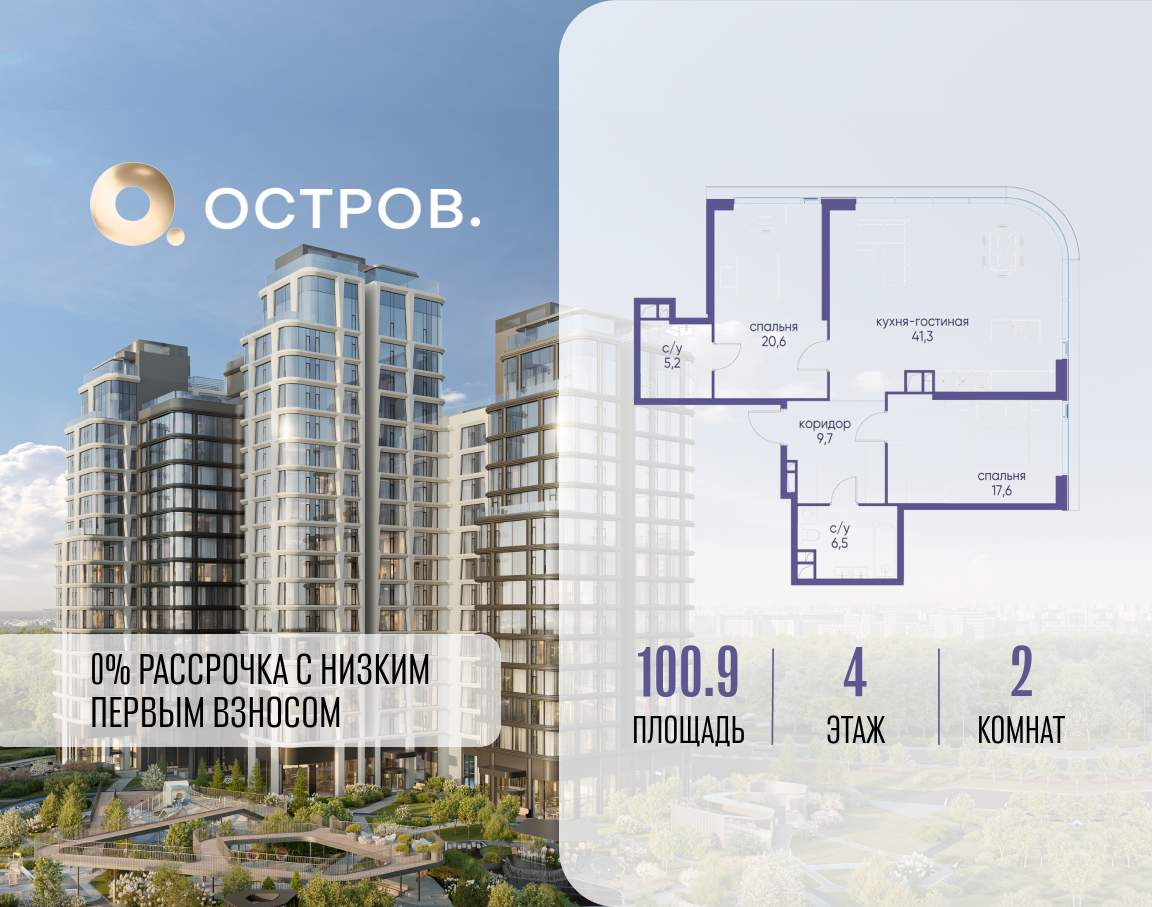 Продаётся 2-комн. квартира от застройщика: общая площадь 100.90 м, жилая 38.20 м, кухня 41.30 м, 4-й этаж, жилой квартал «Остров 12», корпус 6 (секция 1) . Срок сдачи: 1 квартал 2029 года.