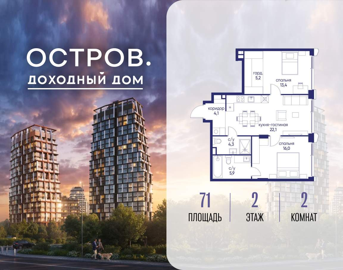 Продаётся 2-комн. квартира от застройщика: общая площадь 71.00 м, жилая 29.40 м, кухня 22.10 м, 2-й этаж, жилой квартал «Остров 14», корпус 4 (секция 1) . Срок сдачи: 2 квартал 2029 года.