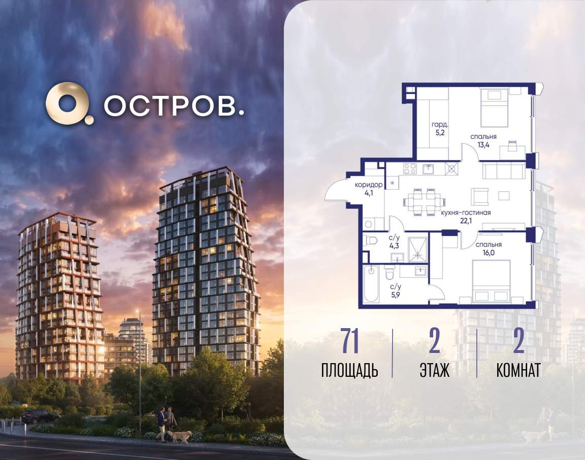 Продаётся 2-комн. квартира от застройщика: общая площадь 71.00 м, жилая 29.40 м, кухня 22.10 м, 2-й этаж, жилой квартал «Остров 14», корпус 4 (секция 1) . Срок сдачи: 2 квартал 2029 года.