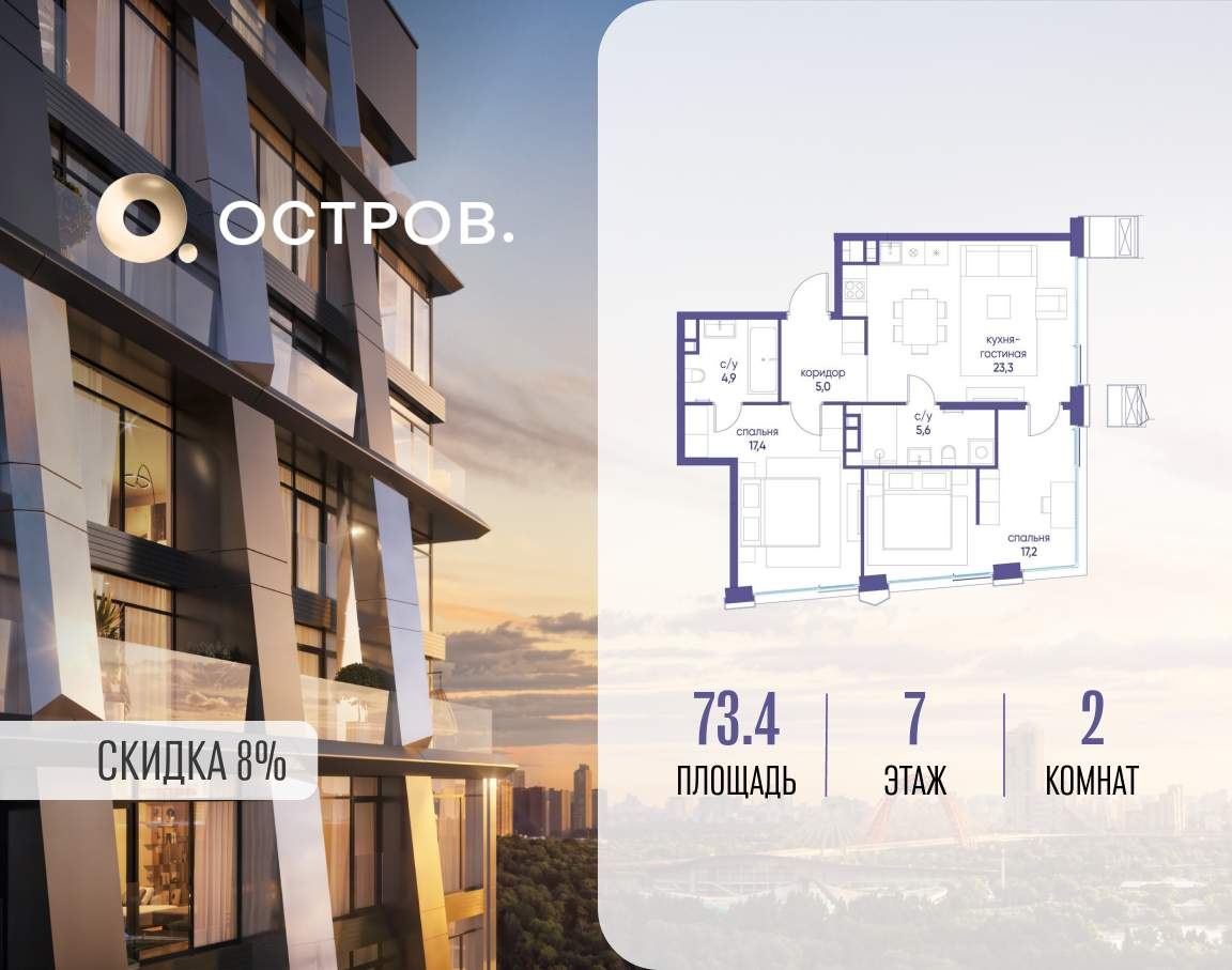 Продаётся 2-комн. квартира от застройщика: общая площадь 73.40 м, жилая 34.60 м, кухня 23.30 м, 7-й этаж, жилой квартал «Остров 12», корпус 2 (секция 1) . Срок сдачи: 1 квартал 2029 года.
