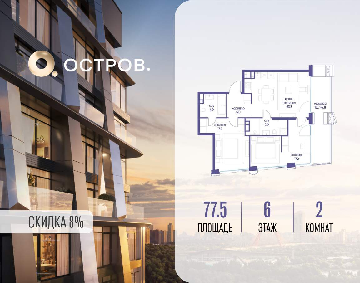 Продаётся 2-комн. квартира от застройщика: общая площадь 77.50 м, жилая 34.60 м, кухня 23.30 м, 6-й этаж, жилой квартал «Остров 12», корпус 2 (секция 1) . Срок сдачи: 1 квартал 2029 года.
