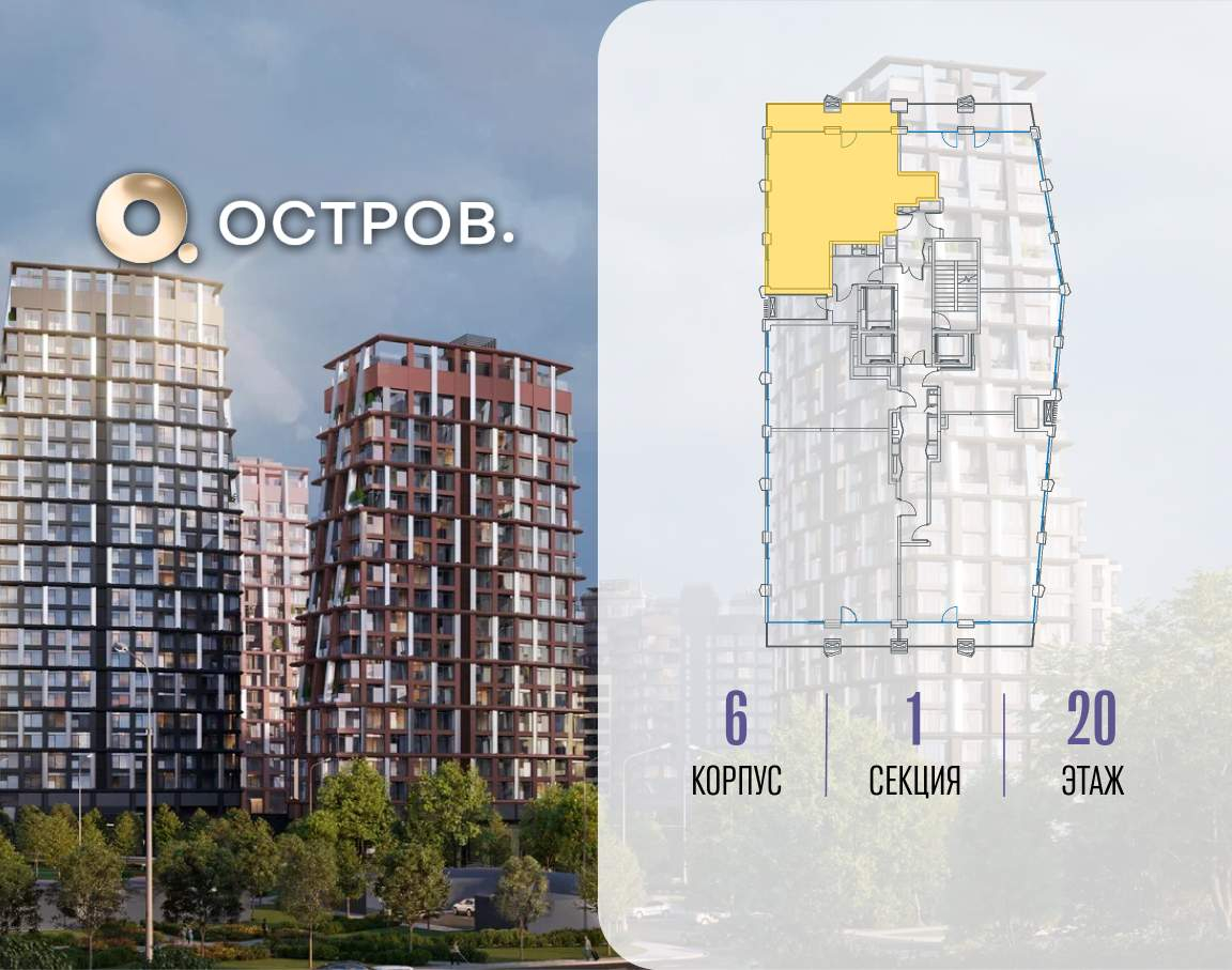 Продаётся 2-комн. квартира от застройщика: общая площадь 77.80 м, жилая 32.90 м, кухня 25.80 м, 20-й этаж, жилой квартал «Остров 14», корпус 6 (секция 1) . Срок сдачи: 2 квартал 2029 года.