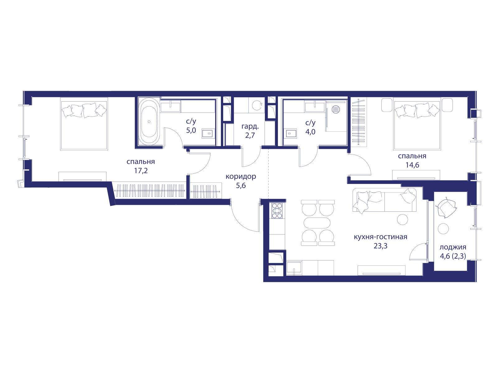 Продаётся 2-комнатная квартира от застройщика: общая площадь 74.70 м, жилая 31.80 м, кухня 23.30 м, 9-й этаж, жилой квартал «Событие-6», корпус 1 (секция 3) Срок сдачи: 4 квартал 2029 года.