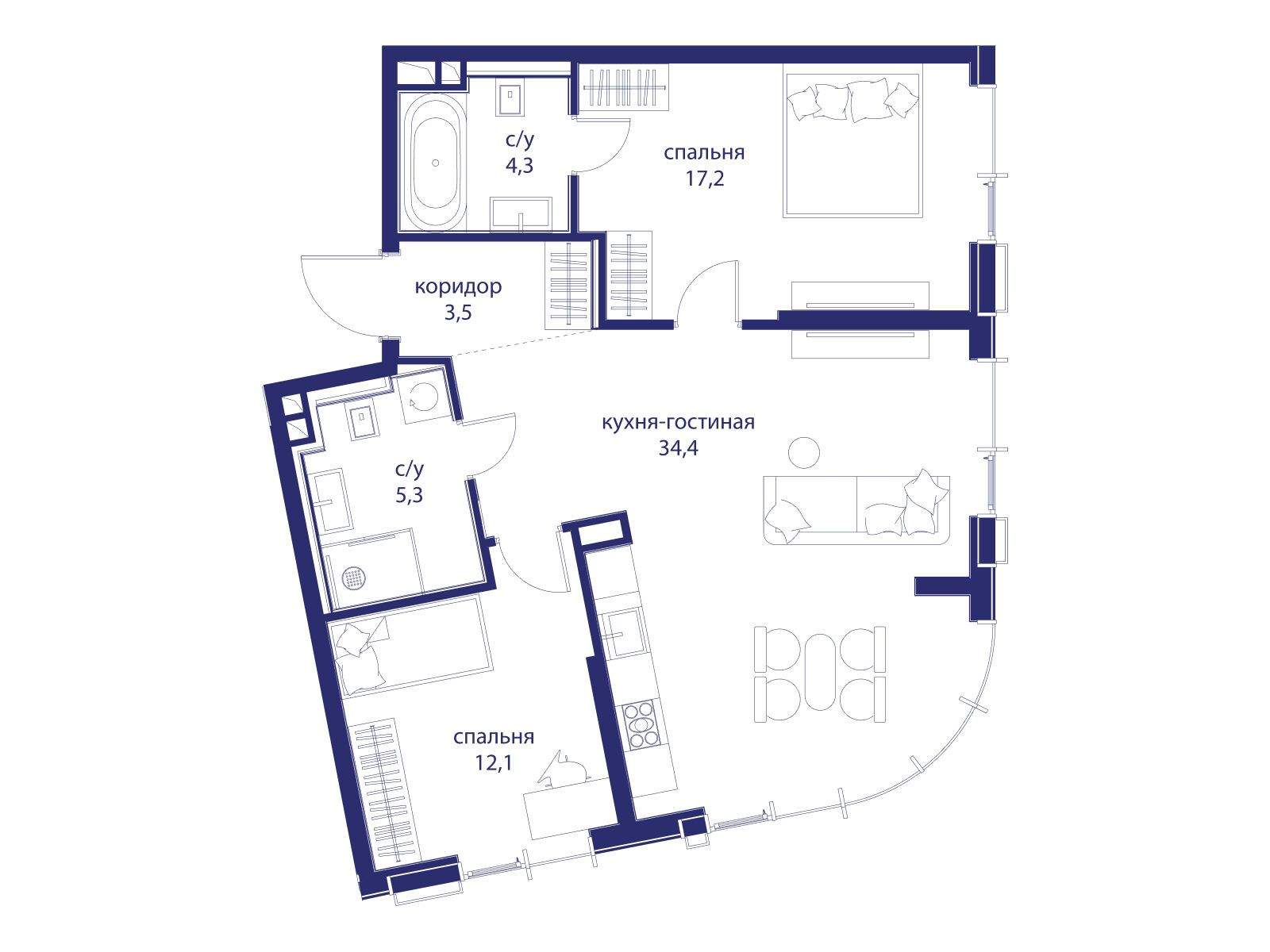 Продаётся 2-комнатная квартира от застройщика: общая площадь 76.80 м, жилая 29.30 м, кухня 34.40 м, 2-й этаж, жилой квартал «Событие-6», корпус 1 (секция 3) Срок сдачи: 4 квартал 2029 года.
