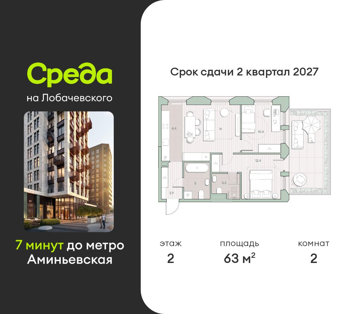 Застройщик - Среда, сдача дома - II квартал 2027 года, высота потолков 2.92 м.