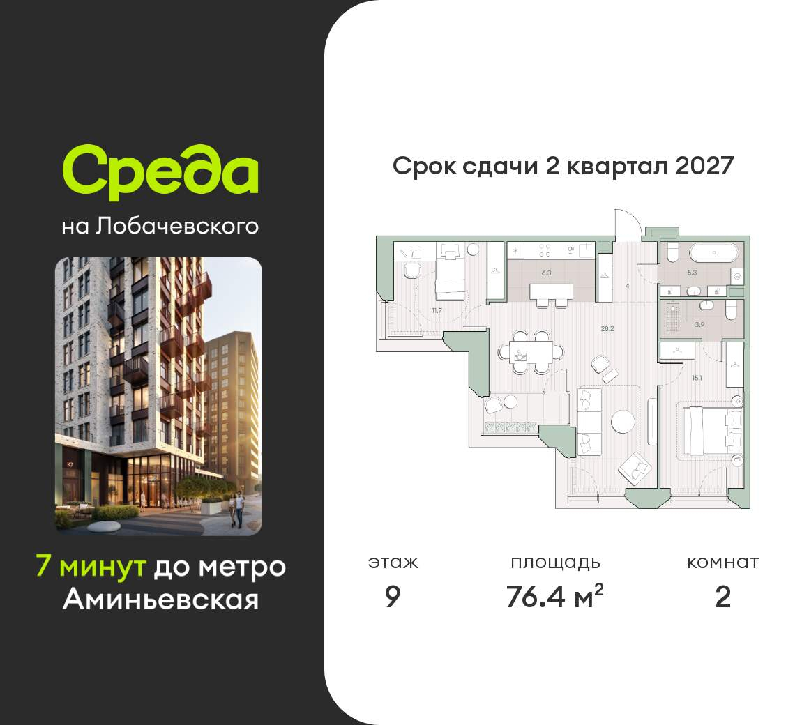 Застройщик - Среда, сдача дома - II квартал 2027 года, высота потолков 2.92 м.
