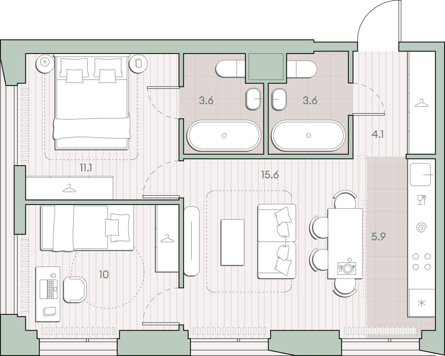 Жилая площадь 36.7 м2, кухня 5.9 м2, квартира без отделки, комнаты изолированные.