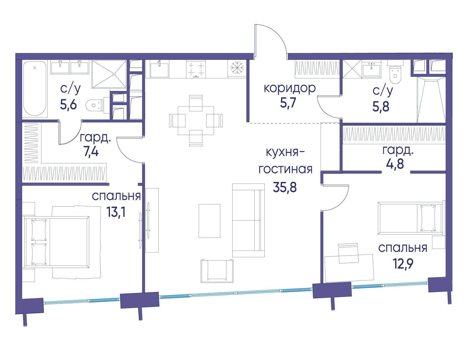 Жилая площадь 82 м2, кухня 25 м2, квартира без отделки, комнаты изолированные, совмещенных санузлов - 1, балконов - 1.