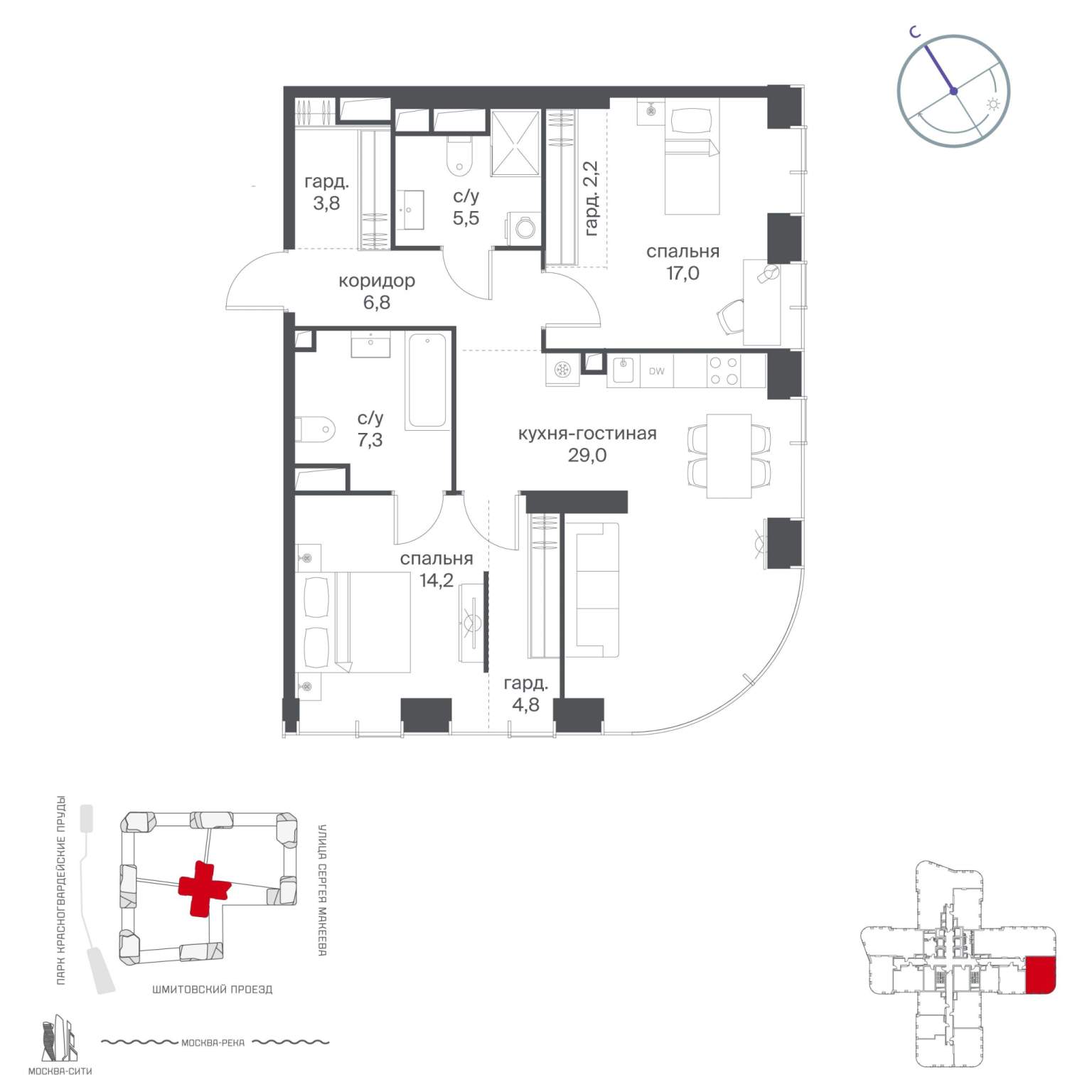 Подземная парковка, парковка охраняется. Обеспечение безопасности: видеонаблюдение, круглосуточная охрана, консьерж, противопожарная система, пропускная система. Инфраструктура: детские площадки, спортивные площадки, места для отдыха, рестораны, фитнес-центр, коммерческие объекты.