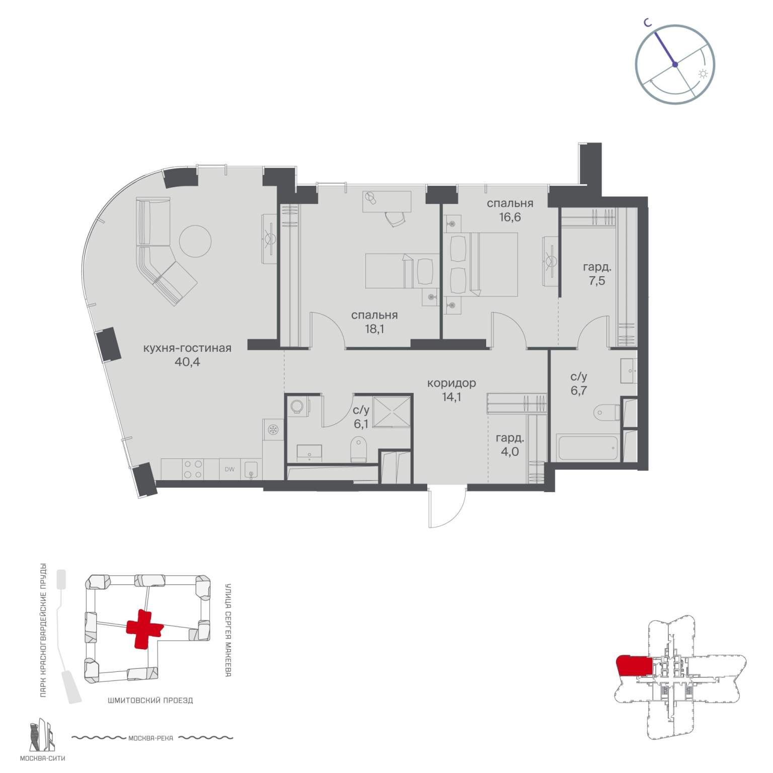 Жилой проект расположен в Пресненском районе Москвы. В пешей доступности находятся станции метро: «Улица 1905 года» (19 минут) , «Москва-Сити» (24 минуты) и «Деловой центр (Выставочная) » (25 минут) .