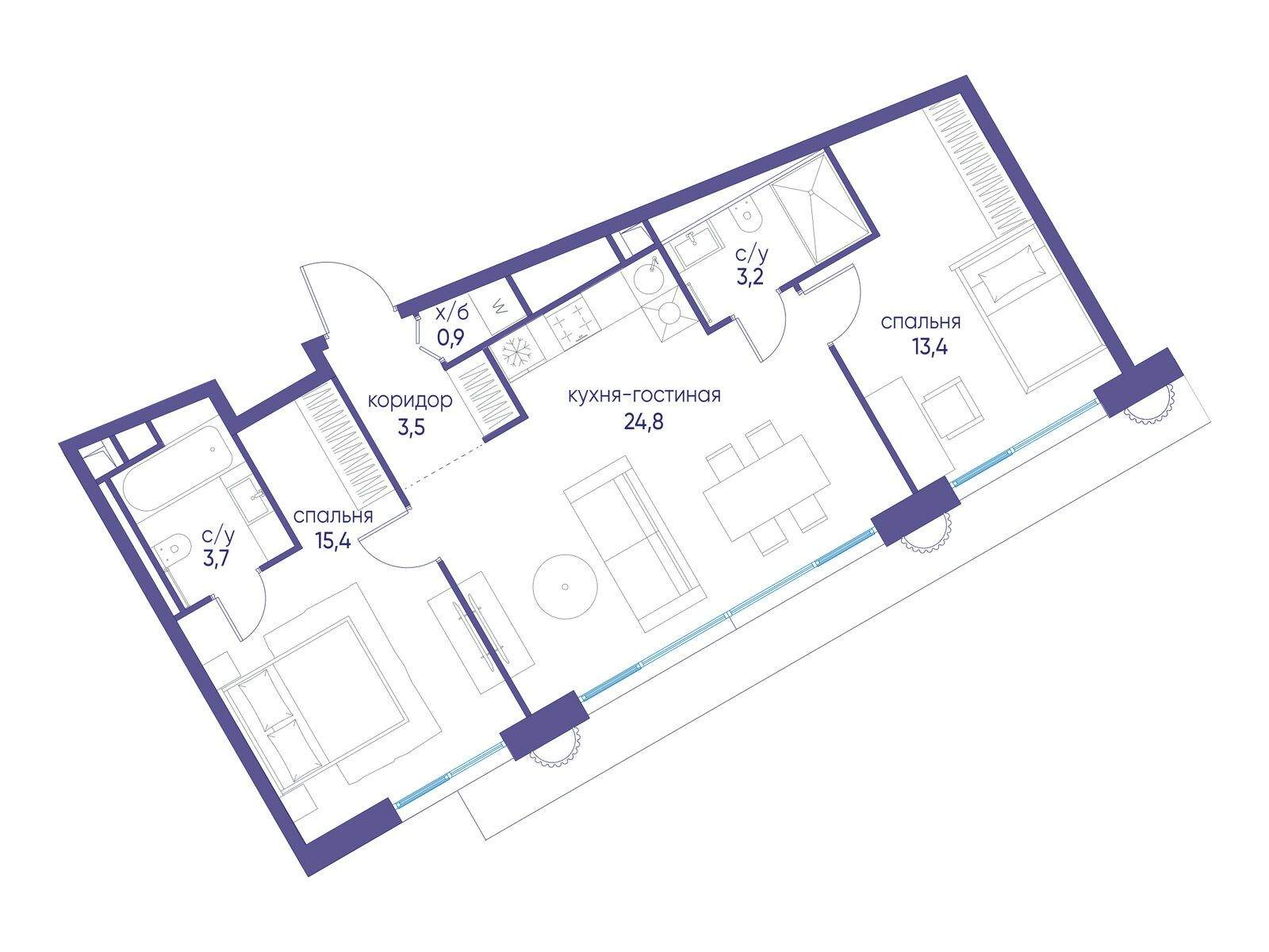 2 совмещенных санузла. В жилой зоне 2 больших окна на одну сторону, хорошая инсоляция.