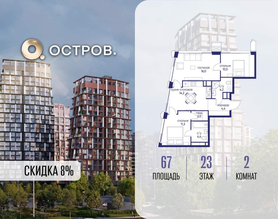 Продаётся 2-комн. квартира от застройщика: общая площадь 67.00 м, жилая 37.80 м, кухня 14.20 м, 23-й этаж, жилой квартал «Остров 14», корпус 4 (секция 1) . Срок сдачи: 2 квартал 2029 года.