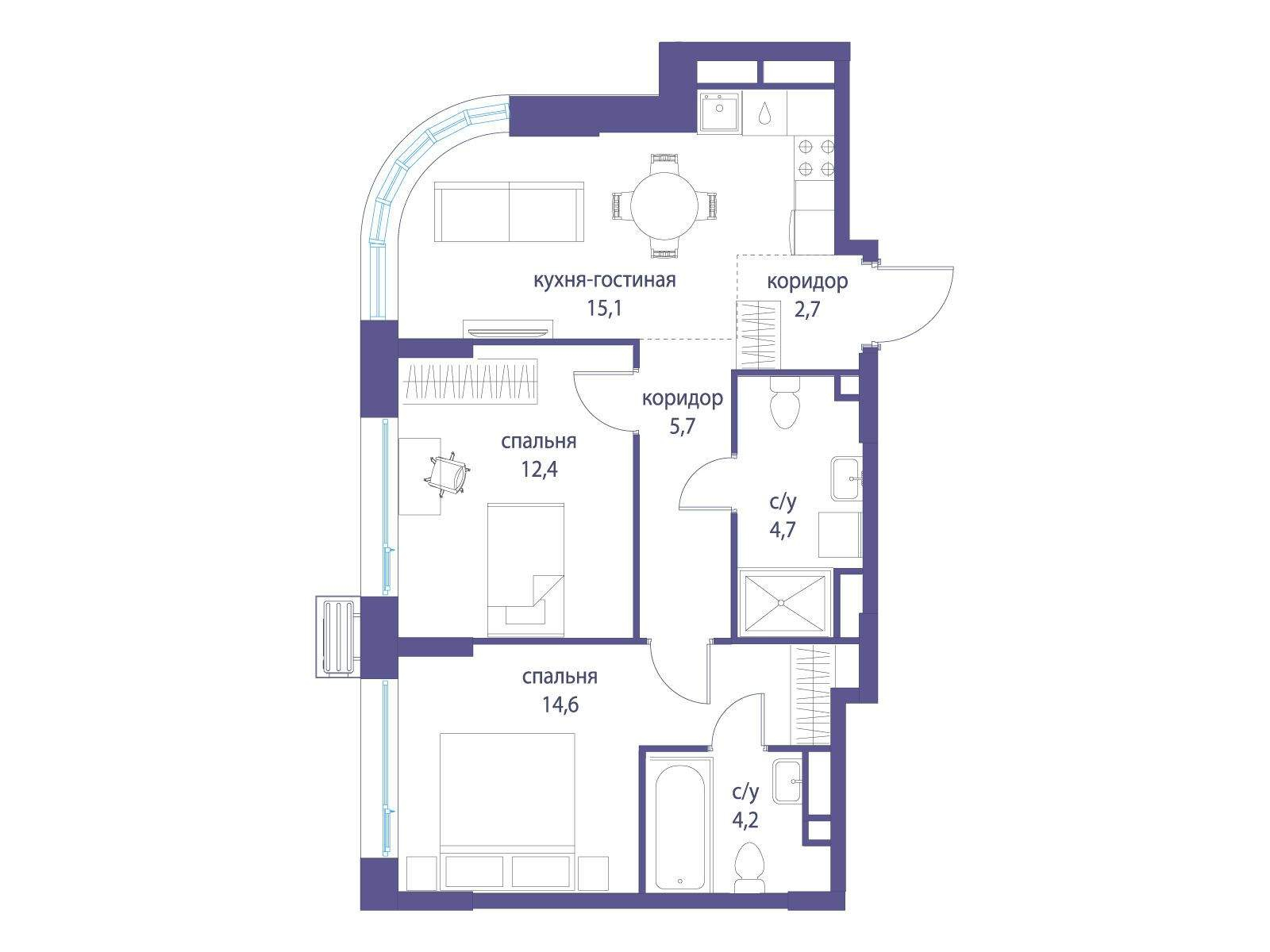 Продается 2-комнатная квартира от застройщика: общая площадь 59.40 м, жилая 27.00 м, кухня 15.10 м, 5-й этаж, жилой квартал «Гордость», корпус 36 (секция 2) . Срок сдачи: 2 квартал 2029 года.
