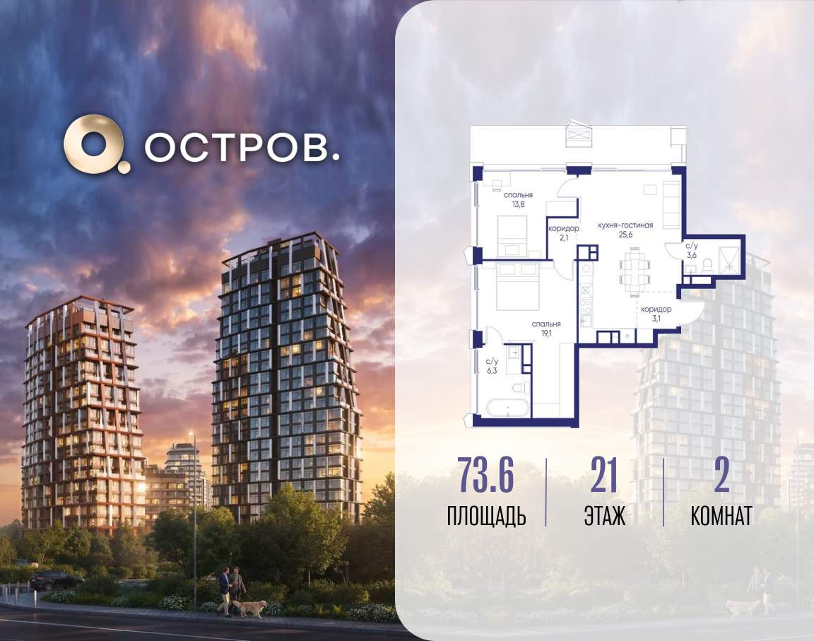 Продаётся 2-комн. квартира от застройщика: общая площадь 73.60 м, жилая 32.90 м, кухня 25.60 м, 21-й этаж, жилой квартал «Остров 14», корпус 6 (секция 1) . Срок сдачи: 2 квартал 2029 года.