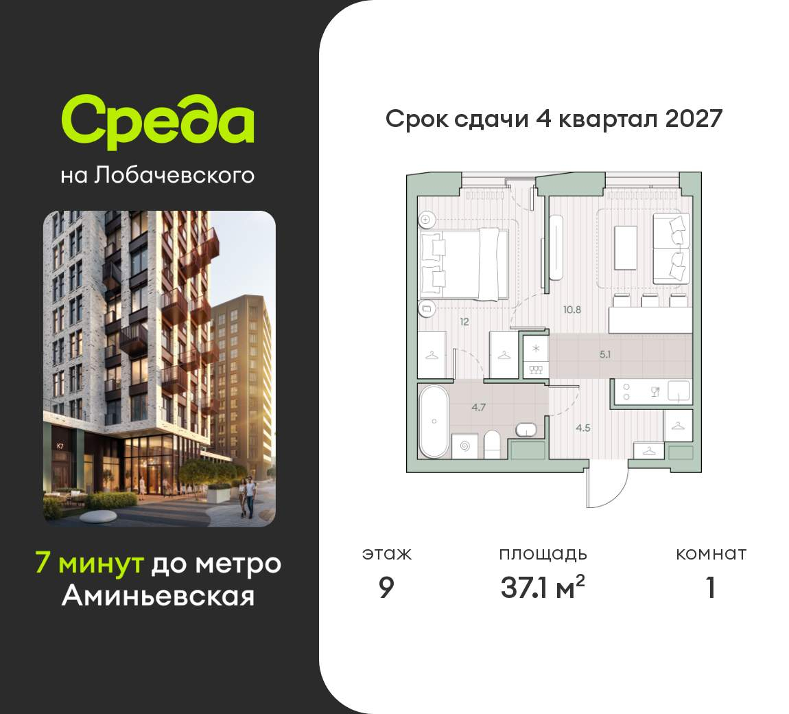 Квартира располагается на 9 этаже 27-этажного дома в ЖК Среда на Лобачевского.