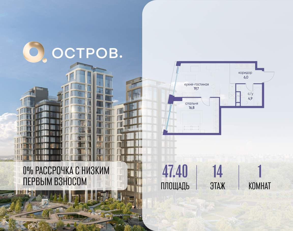 Продаётся 1-комн. квартира от застройщика: общая площадь 47.40 м, жилая 16.80 м, кухня 18.70 м, 14-й этаж, жилой квартал «Остров 12», корпус 1 (секция 2) . Срок сдачи: 1 квартал 2029 года.