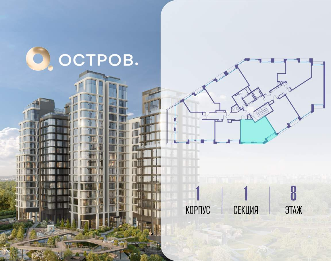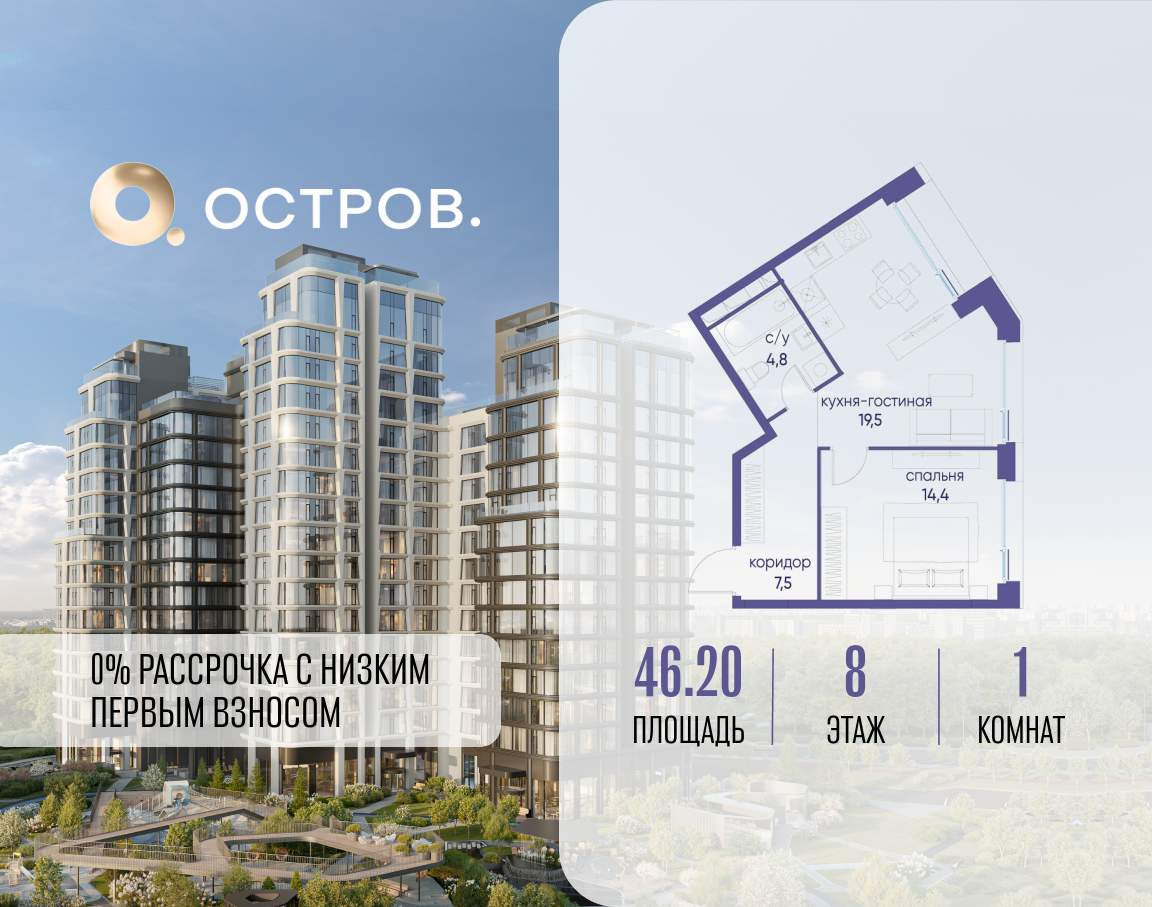 Продаётся 1-комн. квартира от застройщика: общая площадь 46.20 м, жилая 14.40 м, кухня 19.50 м, 8-й этаж, жилой квартал «Остров 12», корпус 1 (секция 1) . Срок сдачи: 1 квартал 2029 года.