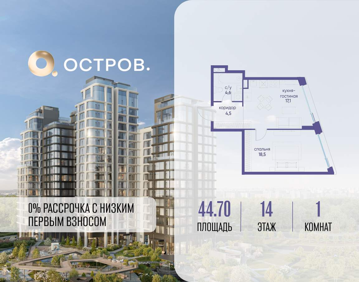 Продаётся 1-комн. квартира от застройщика: общая площадь 44.70 м, жилая 18.50 м, кухня 17.10 м, 14-й этаж, жилой квартал «Остров 12», корпус 1 (секция 2) . Срок сдачи: 1 квартал 2029 года.