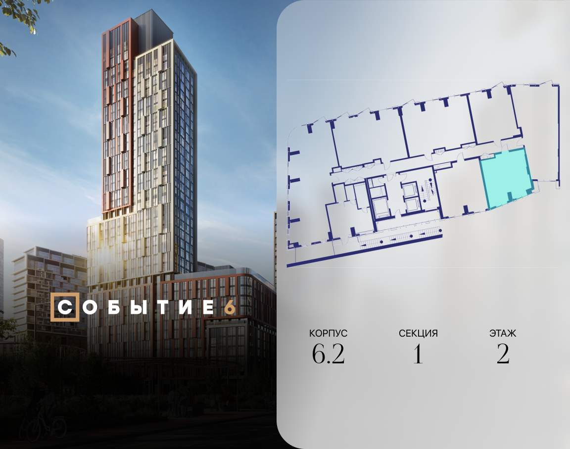 Продаётся 1-комнатная квартира от застройщика: общая площадь 45.30 м, жилая 15.20 м, кухня 22.40 м, 2-й этаж, жилой квартал «Событие-6», корпус 2 (секция 1) Срок сдачи: 1 квартал 2029 года.