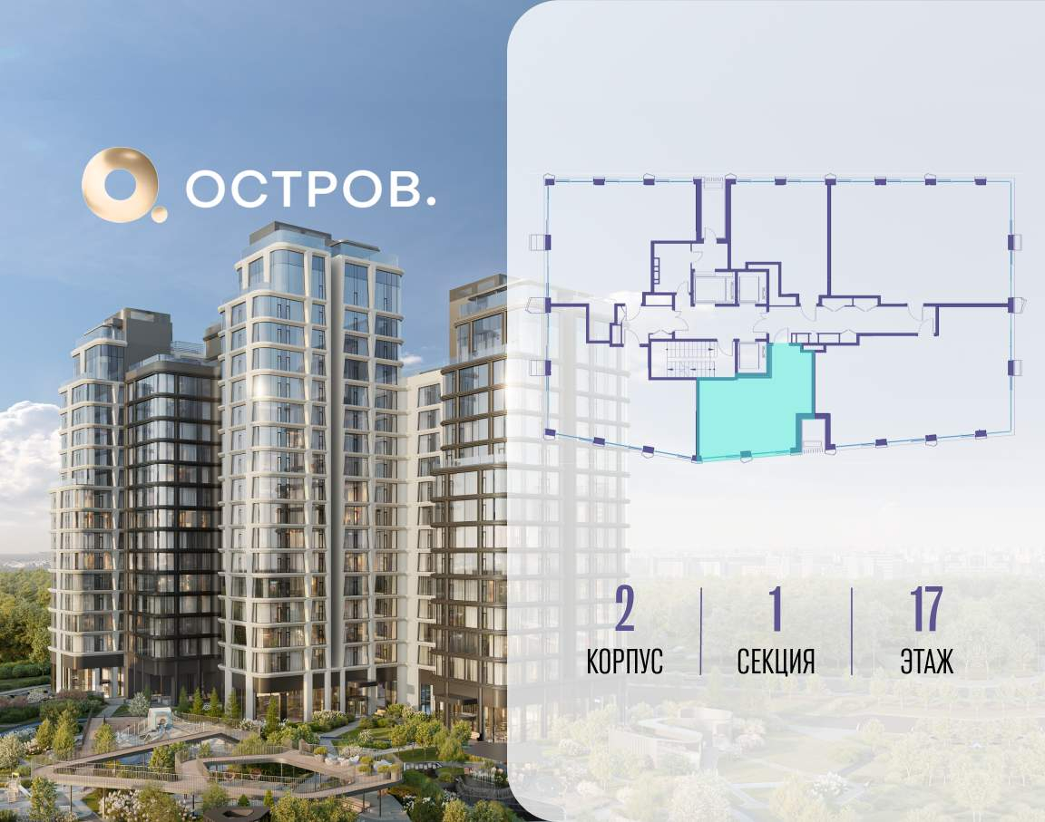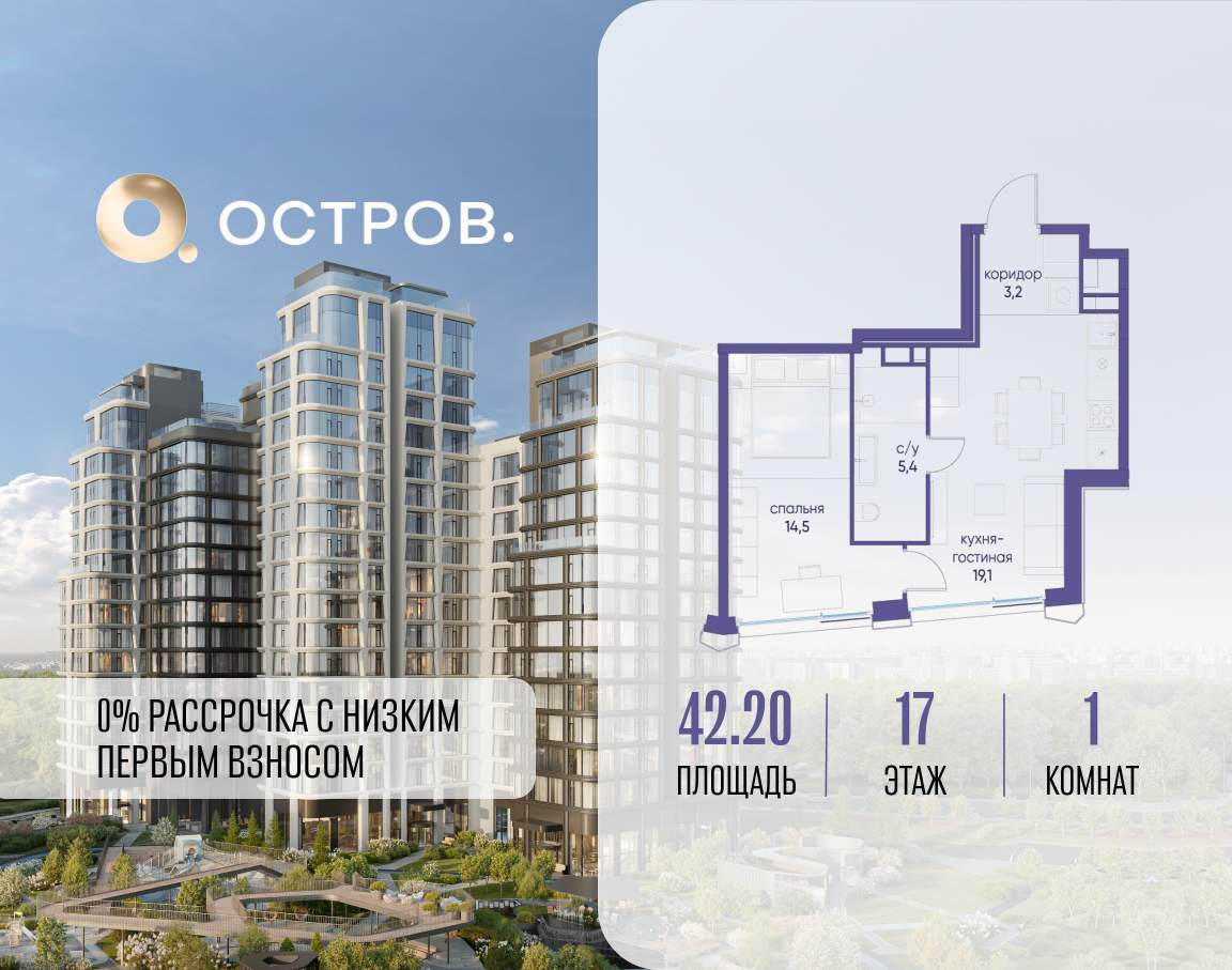 Продаётся 1-комн. квартира от застройщика: общая площадь 42.20 м, жилая 14.50 м, кухня 19.10 м, 17-й этаж, жилой квартал «Остров 12», корпус 2 (секция 1) . Срок сдачи: 1 квартал 2029 года.