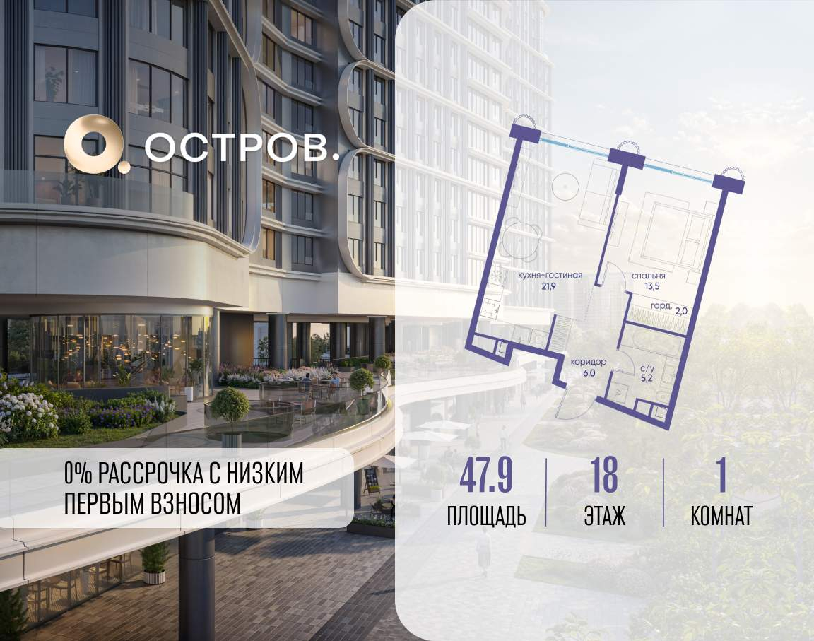 ОСТРОВ от Донстрой - жилой комплекс на западе Москвы, в Мневниковской пойме. Уникальное преимущество комплекса - в том, что он обособлен от города рекой и природным парком (650 га) . Благодаря природному окружению эта территория имеет лучший экологический рейтинг в столице. Кварталы ОСТРОВА объединены ландшафтным дизайном в единое пространство - с набережными и Центральным бульваром. На ОСТРОВЕ любые объекты, необходимые для полноценной жизни и отдыха, находятся на расстоянии 15-минутной прогулки. Торговый центр и супермаркеты, кафе и рестораны, фитнес, салоны красоты, школы и детские сады. А также крупнейший в Москве спортивный кластер.