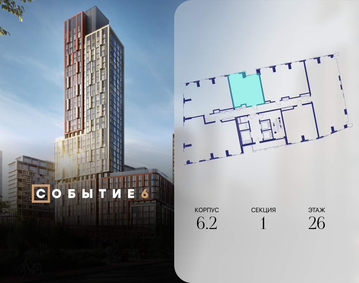Продаётся 1-комнатная квартира от застройщика: общая площадь 44.80 м, жилая 17.00 м, кухня 20.20 м, 26-й этаж, жилой квартал «Событие-6», корпус 2 (секция 1) Срок сдачи: 1 квартал 2029 года.