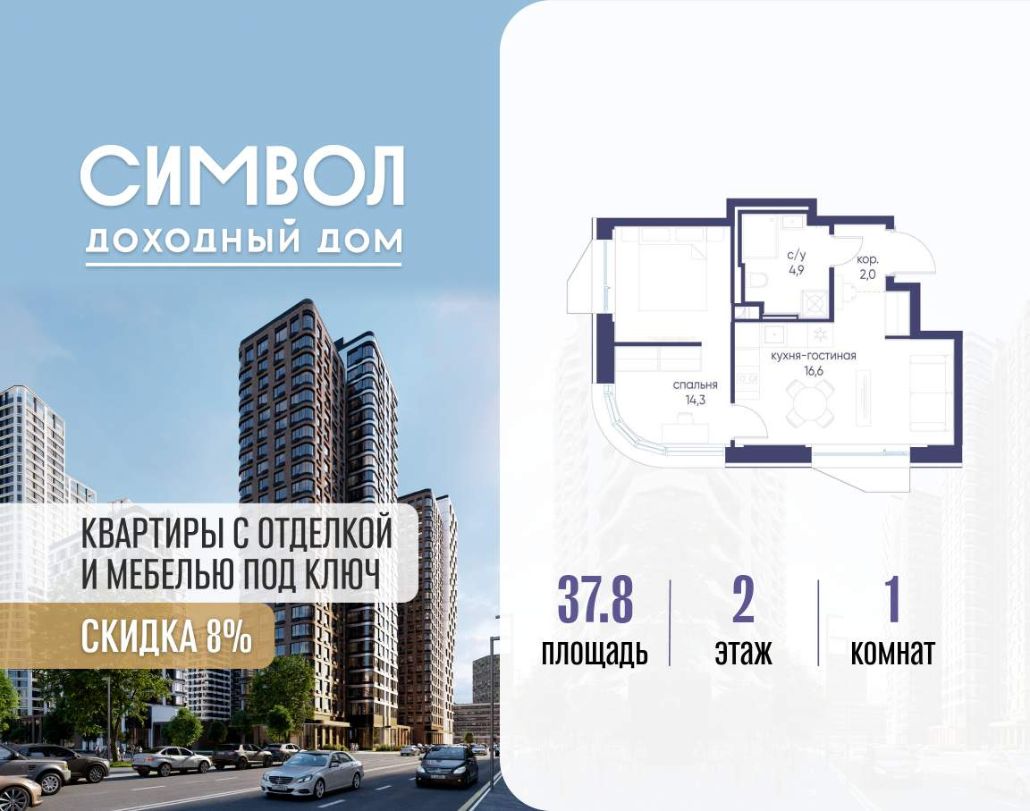 Продается 1-комнатная квартира от застройщика: общая площадь 37.80 м, жилая 14.10 м, кухня 16.10 м, 2-й этаж, жилой квартал «Гордость», корпус 40 (секция 1) . Срок сдачи: 2 квартал 2029 года.